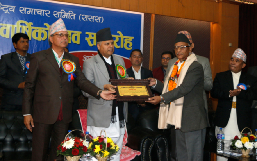 वार्षिकोत्सवका अवसरमा यहाँ आज आयोजित कार्यक्रममा राससका पूर्वअध्यक्ष प्रा खरेल र पूर्वप्रमुख समाचारदाता प्रा रेग्मीलाई सूचना तथा सञ्चार मन्त्रालयका सचिव केदारबहादुर अधिकारीले सम्मान गर्नुभयो ।