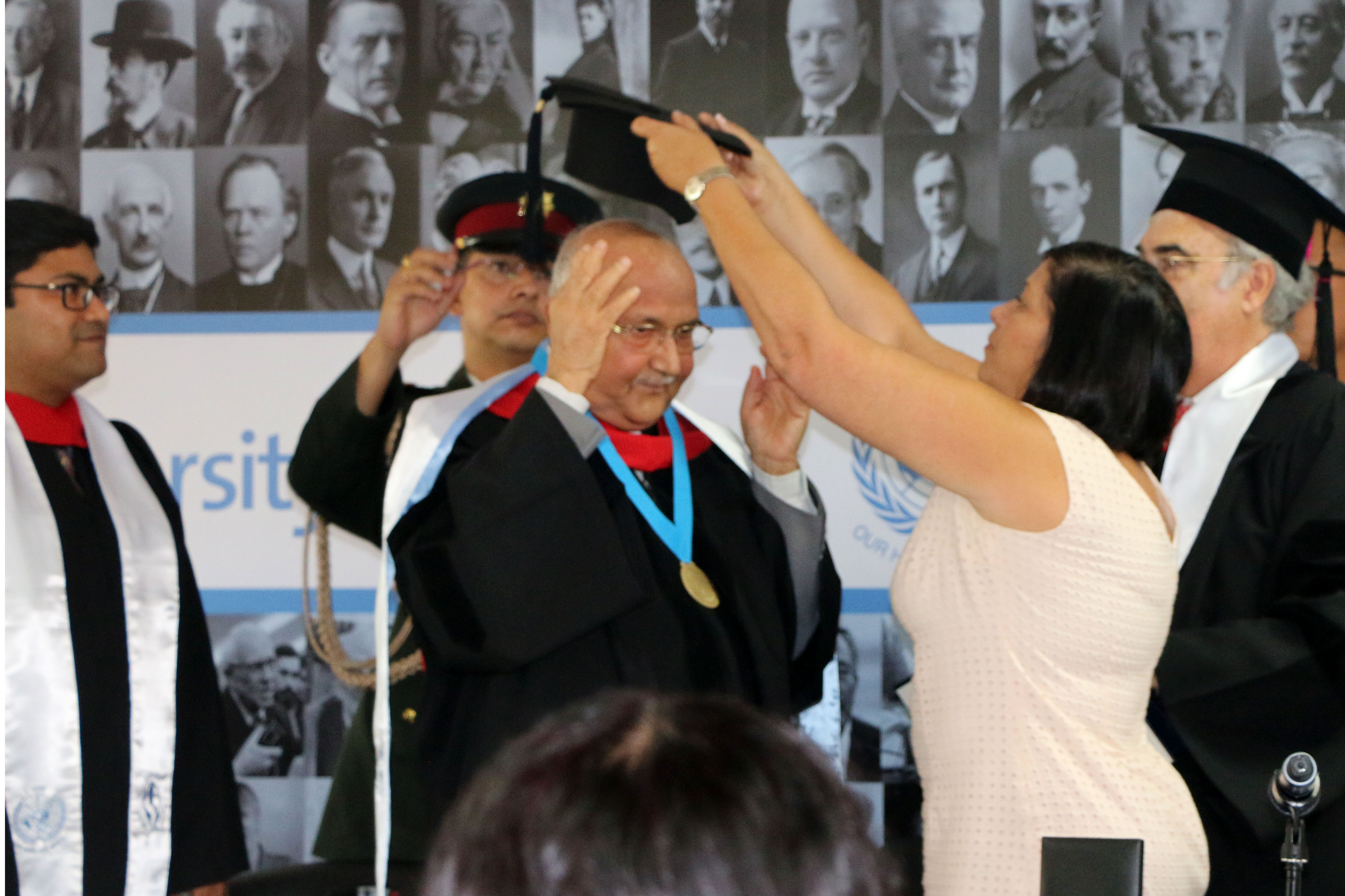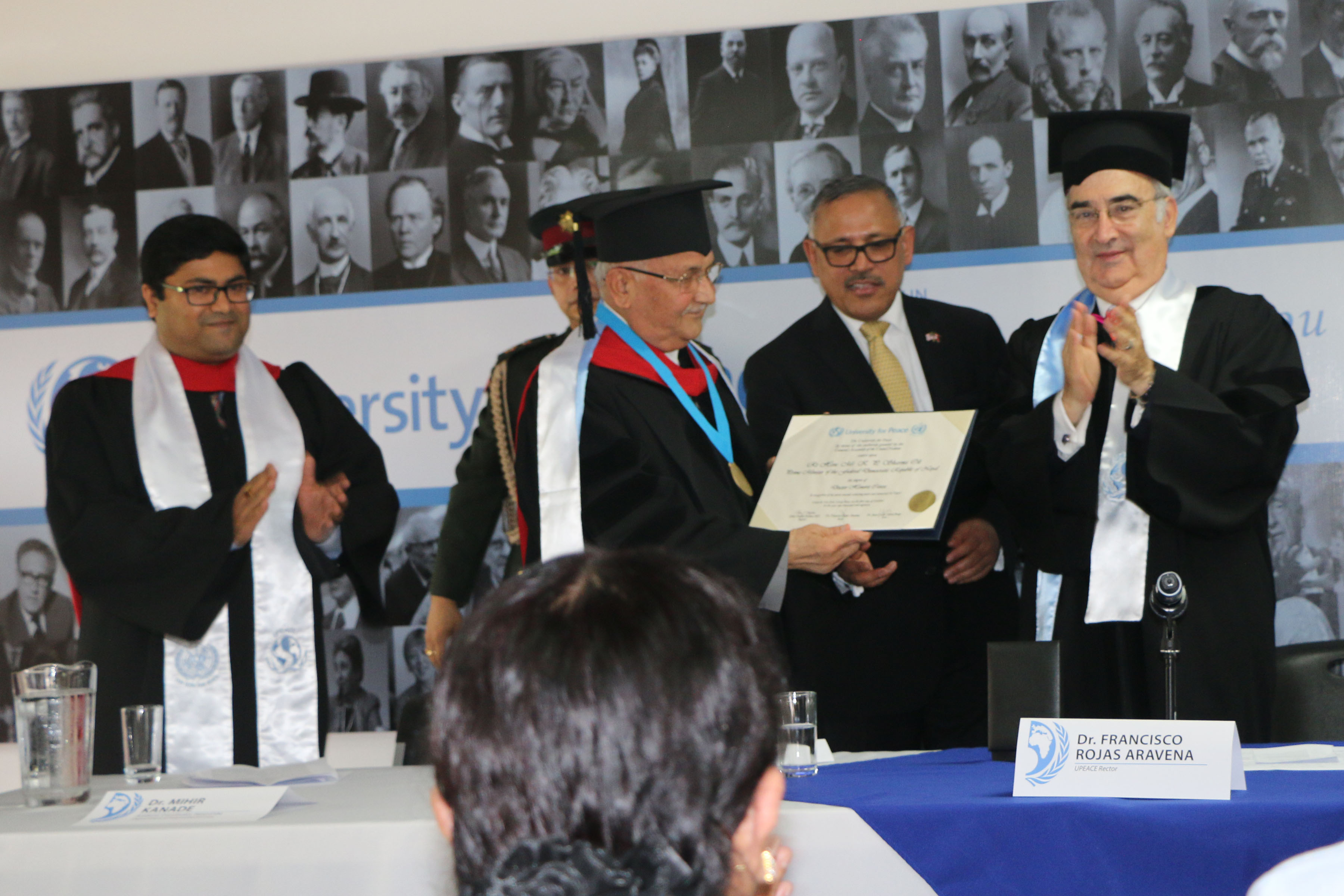 युनिभर्सिटी फर पिस (शान्ति विश्वविद्यालय) ले प्रधानमन्त्री केपी शर्मा ओलीलाई नेपालमा शान्ति तथा प्रजातन्त्र प्राप्तिका लागि पु¥याएको योगदानको कदर गर्दै मानार्थ विद्यावारिधिको उपाधि ‘डक्टर्स अनरिस कजा’ प्रदान गरेको छ ।