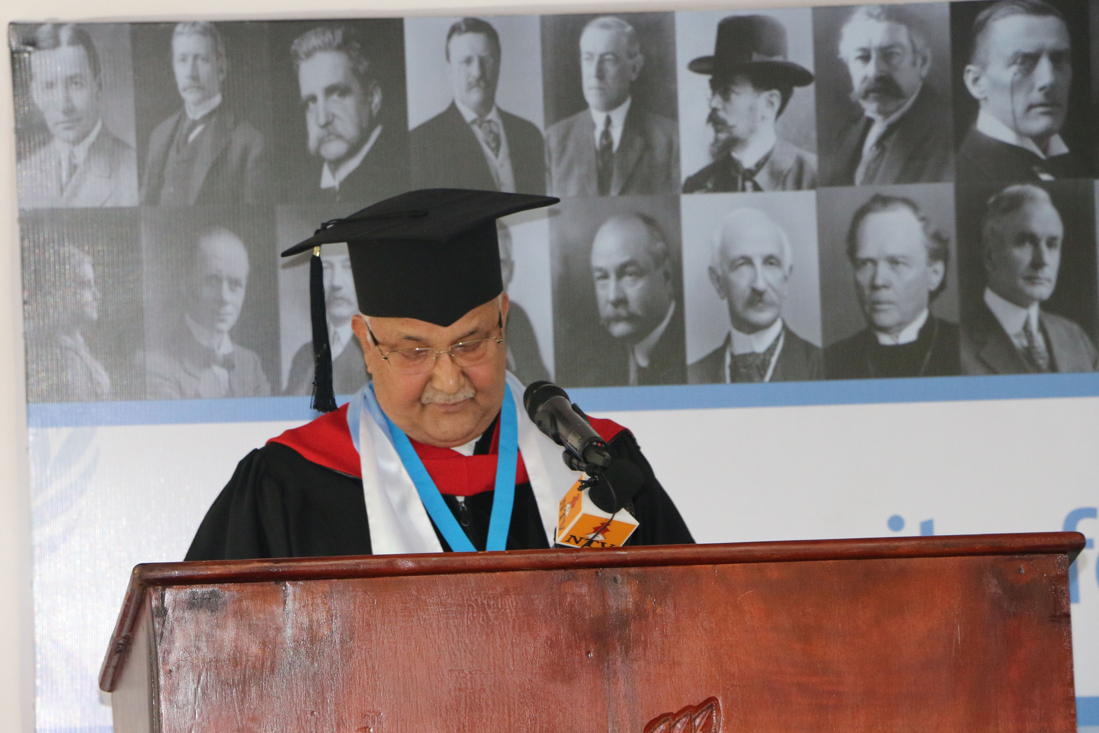 प्रधानमन्त्री केपी शर्मा ओली सान होजेमा आयोजित समारोहमा मानार्थ डक्टरको उपाधि ‘डक्टर्स अनरिस कजा’ प्राप्त गरेपछि सम्बोधन गर्दै ।