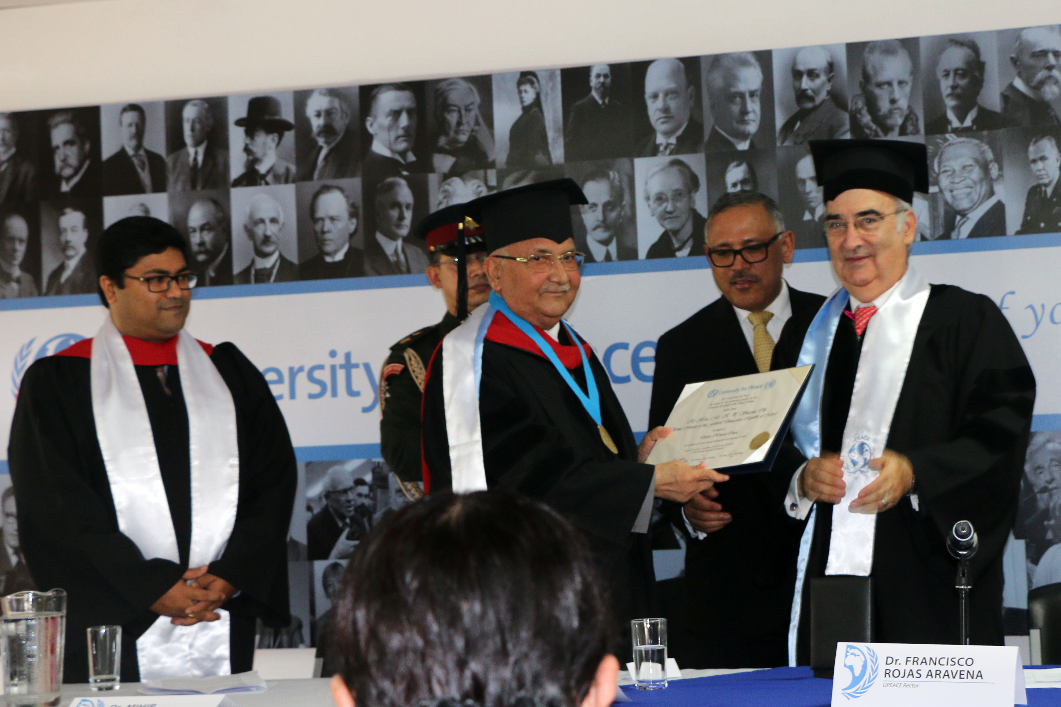 प्रधानमन्त्री केपी शर्मा ओलीलाई नेपालमा शान्ति तथा प्रजातन्त्रका लागि दिएको योगदानवापत युनिभरसिटी फर पिस (शान्ति विश्वविद्यालय)ले सान होजेमा आयोजित समारोहमा मानार्थ डक्टरको उपाधि