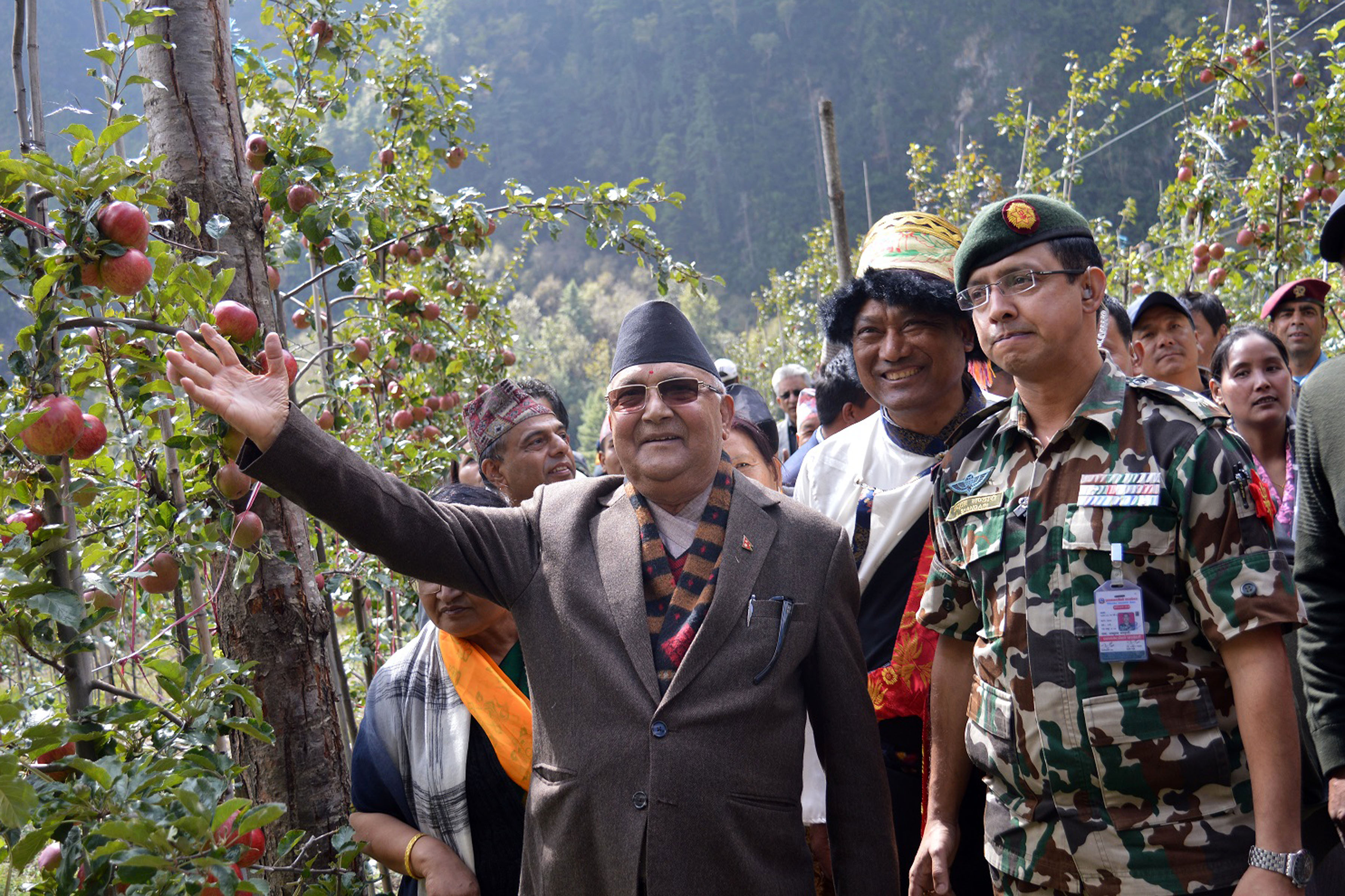 प्रधानमन्त्री केपी शर्मा ओलीले हिमाली जिल्ला मनाङको मनाङ ङिस्याङ गाउँपालिका–१ भ्राताङमा एग्रो मनाङ प्रालिले स्थापना गरेको स्याउ फार्मको आज उद्घाटन गर्नुभयो ।
