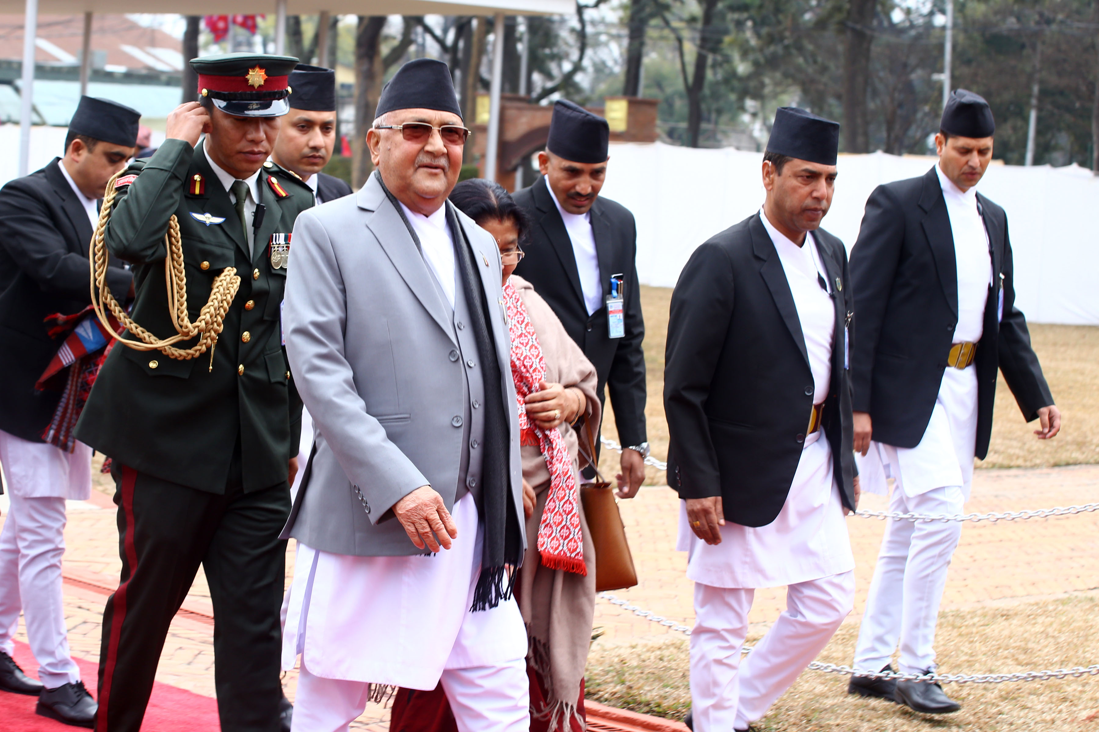 प्रधानमन्त्रीलाई विमानस्थलको अति विशिष्ट कक्षमा सभामुख कृष्णबहादुर महरा, राष्ट्रियसभाका अध्यक्ष गणेशप्रसाद तिमिल्सिना, उप्रप्रधानमन्त्री ईश्वर पोखरेल, मन्त्रिपरिषद्का सदस्य, संवैधानिक अङ्गका प्रमुख, नेपाल सरकारका सचिव निमित्त परराष्ट्र सचिव भरतराज पौड्यालले स्वागत गर्नुभएको थियो ।
