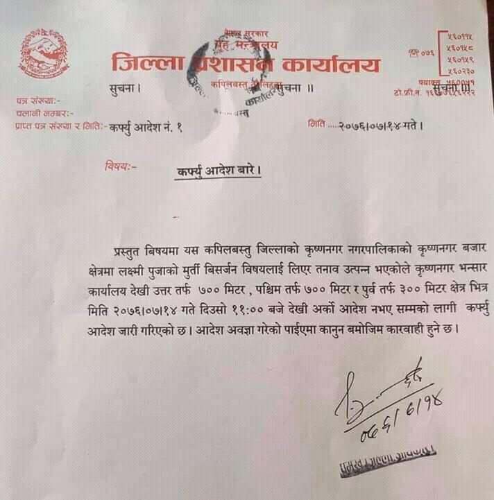 लक्ष्मीको मूर्ति विसर्जन गर्ने क्रममा विवाद हुँदा कपिलवस्तुको कृष्णनगर बजार क्षेत्रमा कर्फ्यू जारी गरिएको छ । बिहान ११ बजेदेखि अर्को आदेश नभएसम्म कर्फ्यू लगाइएको जिल्ला प्रशासन कार्यालय कपिलवस्तुले जनाएको छ ।