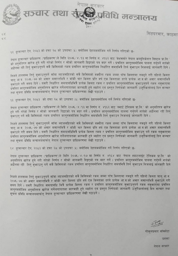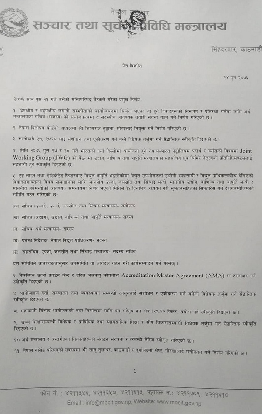 काठमाडौँ । पुस २१ गते बसेको मन्त्रिपरिषद्ले विभिन्न १४ वटा निर्णय गरेको छ । बिहीबार सूचना तथा संचार प्रविधिमन्त्री गोकुल प्रसाद बाँस्कोटाले मन्त्रालयमा नियमित पत्रकार सम्मेलन मार्फत मन्त्रिपरिषद्का निर्णय सार्वजनिक गरेका हुन् ।