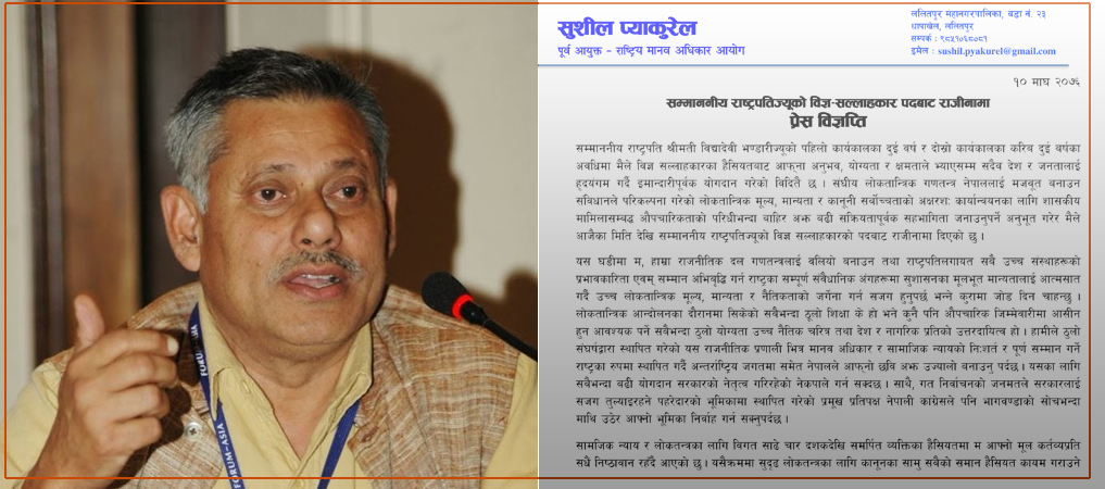 काठमाडौं । राष्ट्रपतिका राजनीतिक सल्लाहकार सुशील प्याकुरेलले पदबाट राजीनामा दिएका छन् । राष्ट्रपति विद्यादेवी भण्डारीसमक्ष प्याकुरेलले शुक्रबार बुझाएको राजीनामा स्वीकृत भएको राष्ट्रपति कार्यालयले जनाएको छ।