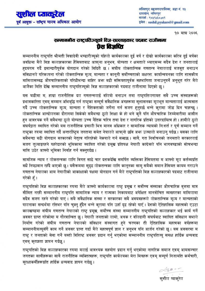 राजीनामा पत्रमा उनले भनेका छन् ‘संविधानले परिकल्पना गरेको लोकतान्त्रिक मूल्य, मान्यता र कानूनी सर्वोच्चताको अक्षरशः कार्यान्वयनका लागि शासकीय मामिलासम्बद्ध औपचारिकताको परिधीभन्दा बाहिर अझ बढी सक्रियतापूर्वक सहभागिता जनाउनुपर्ने अनुभूत गरेर मैले आजैका मिति देखि सम्माननीय राष्ट्रपतिज्यूको विज्ञ सल्लाहकारको पदबाट राजीनामा दिएको छु ।’
