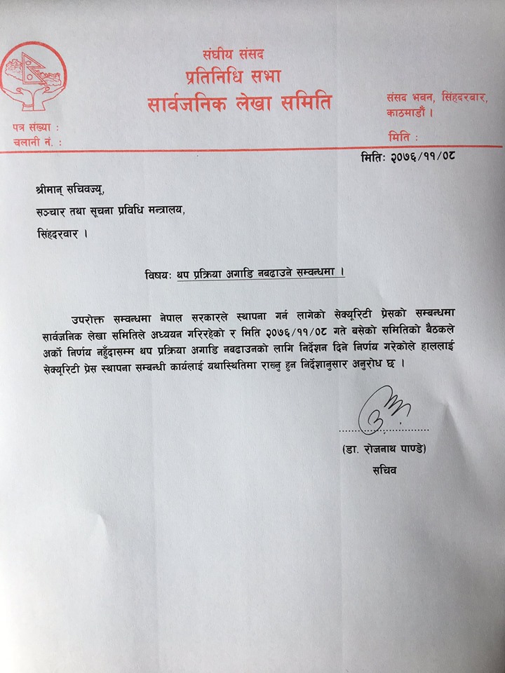 काठमाडौं । संसदको सार्वजनिक लेखा समितिले सेक्युरिटी प्रिन्टिङ प्रेस खरिद प्रक्रिया अगाडि नबढाउन निर्देशन दिएको छ।