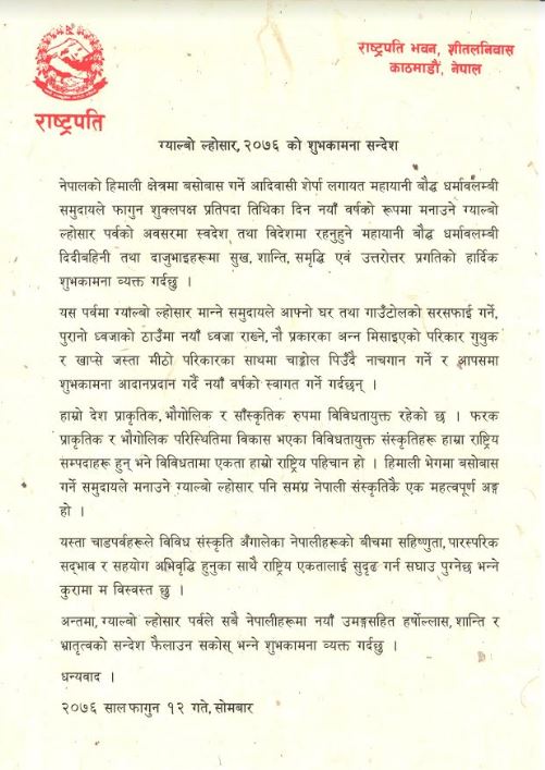 राष्ट्रपति भण्डारीले ग्याल्बो ल्होसार पर्वले सबै नेपालीमा नयाँ उमङ्गसहित हर्षाेल्लास, शान्ति र भ्रातृत्वको सन्देश फैलाउन सकोस् भन्ने शुभकामना व्यक्त गर्नुभएको छ ।