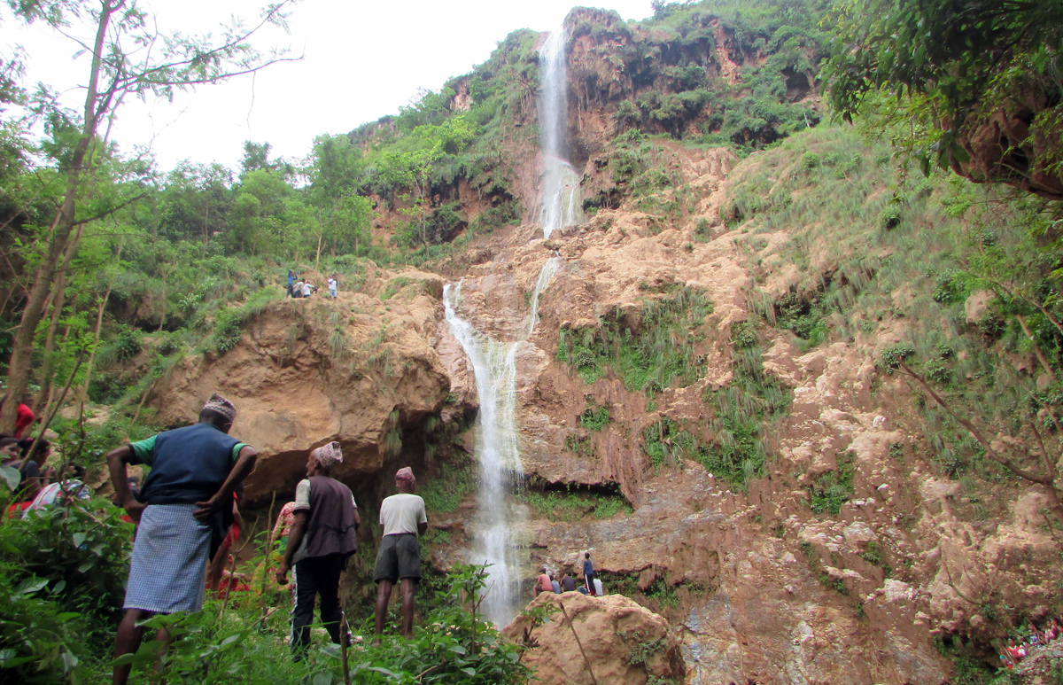 गल्छी गाउँपालिका–३ मा रहेको छाँगेश्वर झरनामा मनोरञ्जन लिँदै आन्तरिक पर्यटक । छाँगेश्वर महादेव मन्दिरको नामबाट झरनाको नाम राखिएको स्थानीय बुढापाका बताउँछन । पुथ्वी राजमार्गको आदमघाटबाट एक घण्टाको पैदल यात्रापछि झरना पुग्न सकिन्छ । तस्बिरः सीताराम अधिकारी÷रासस
