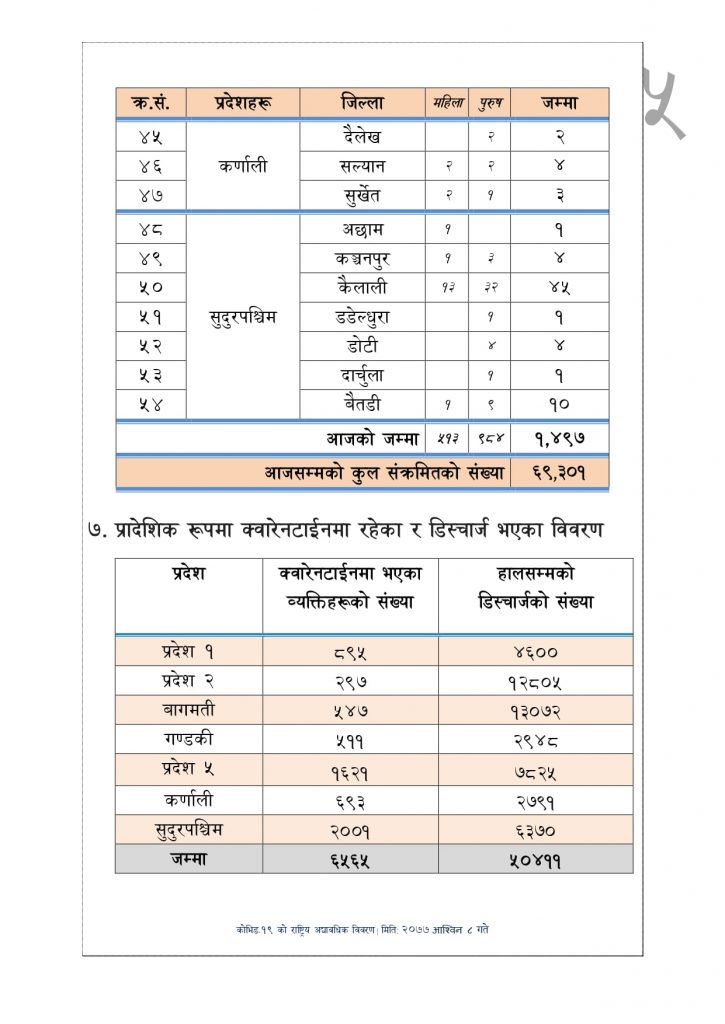त्यस्तै पछिल्लो २४ घण्टामा देशभरमा गरेर १ हजार ४९७ जनामा कोरोना भाइरसको संक्रमण पुष्टि भएको छ। योसँगै नेपालमा कुल संक्रमितको संख्या ६९ हजार ३०१ पुगेको स्वास्थ्य मन्त्रालयका प्रवक्ता डा जागेश्वर गौतमले जानकारी दिएका छन्।