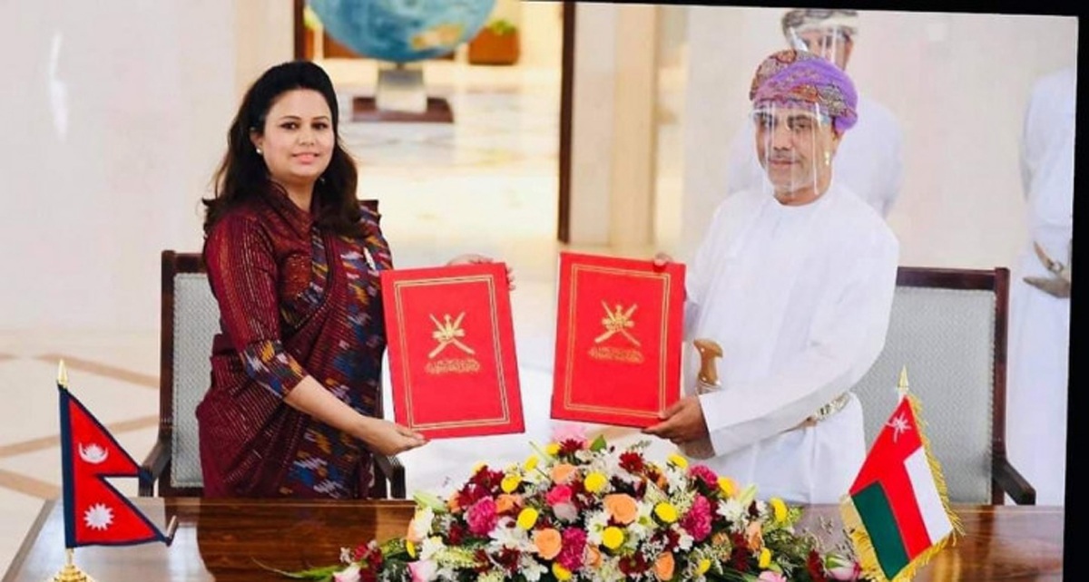ओमानको परराष्ट्र मन्त्रालयमा सोमबार आयोजित एक कार्यक्रमका बीच नेपाल सरकारको तर्फबाट ओमानका लागि नेपाली राजदूत सर्मिला पराजुली ढकाल र ओमानको तर्फबाट परराष्ट्र मन्त्रालयका सचिव (प्रशासन तथा लेखा) मोहम्मद विन नासिर विन मोहम्मद अल वहेबिले हस्ताक्षर गरेको दूतावासले जनाएको छ ।