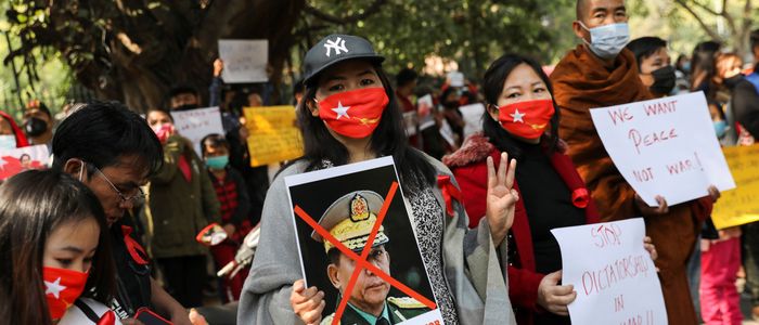 प्रदर्शनकारीले म्यान्मारकी प्रजातन्त्रवादी नेतृ आङ सान सुकी र राष्ट्रपति विन मिन्टको विनाशर्त रिहाई गर्न माग गरेका छन् ।