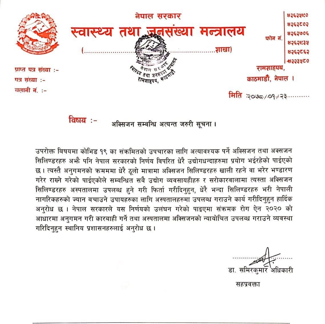 मन्त्रालयले बिहीबार एक विज्ञप्ति जारी गर्दै कोरोना सङ्क्रमितको उपचारका लागि प्रयोग हुने अक्सिजन सिलिण्डरमा कालोबजारी भएको निष्कर्ष निकाल्दै कडा कारबाही गरिने जानकारी दिएको छ ।