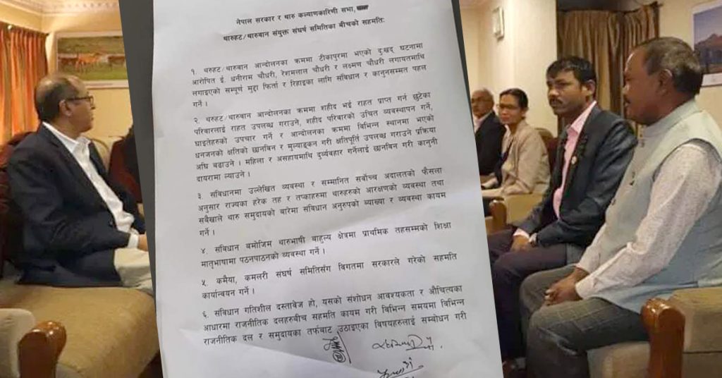 Among other points of the pact include providing relief to the families of martyrs of Tharuhat-Tharuwan struggle who were left in the process of receiving relief, managing martyrs’ families, providing treatment to the injured and taking forward the process of compensation after probing and assessing the loss of lives and properties in different areas in course of the struggles and book those who meted out misbehave to women and helpless.