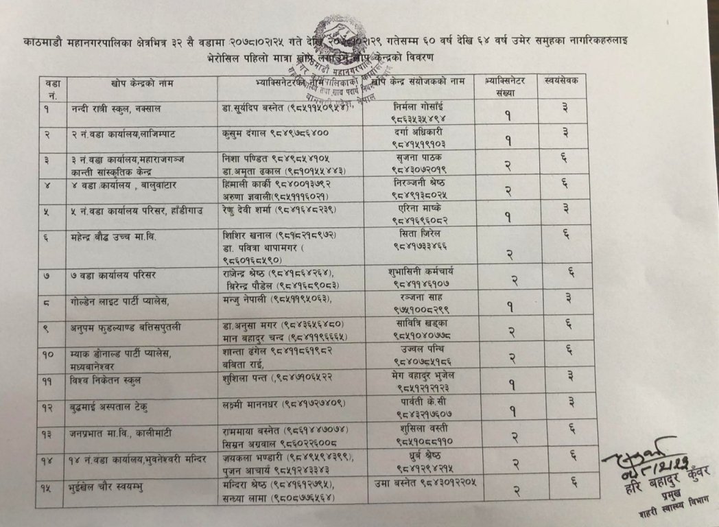 महानगरपालिकाले भेरोसेल खोपको दोस्रो डोज लगाइएको खोप केन्द्रमा नै यसपटक पनि खोप केन्द्र सञ्चालन गर्ने भएको प्रवक्ता महर्जनले बताउनुभयो। प्रवक्ता महर्जनले आफूलाई पायक पर्ने जुनसुकै खोप केन्द्रमा गई मंगलबार र बुधबार खोप लगाउन सकिने जानकारी दिनुभयो ।