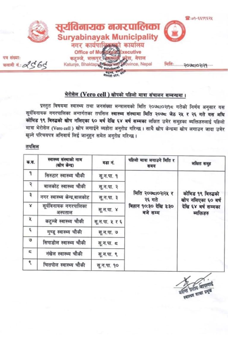 त्यसैगरी भक्तपुर नगरपालिकाले कोरोना भाइरसविरुद्ध चीनले नेपाललाई उपलब्ध गराएको भेरोसेल खोपको पहिलो मात्रा लगाउन ६० देखि ६४ वर्ष उमेर समूहका सम्पूर्ण नागरिकहरुलाई आग्रह गरेको छ । आफू बसोबास गर्ने वडा नजिकको खोप केन्द्रमा गई स्वास्थ्य मापदण्डको पालना गरी खोप लगाउन आग्रह गरेको हो । भक्तपुर नगरपालिकाका १० वटै वडामा जेठ २५ र २६ गते खोप लगाइने जनाइएको छ । खोप मङ्गलबार बिहान १० बजेदेखि अपराह्न ४ बजेसम्म लगाउने समयतालिका निर्धारण गरिएको छ ।