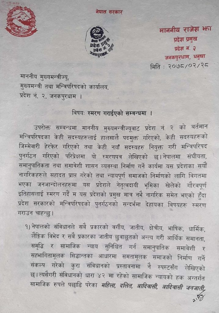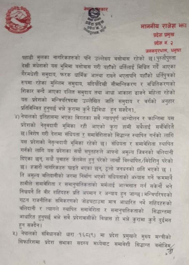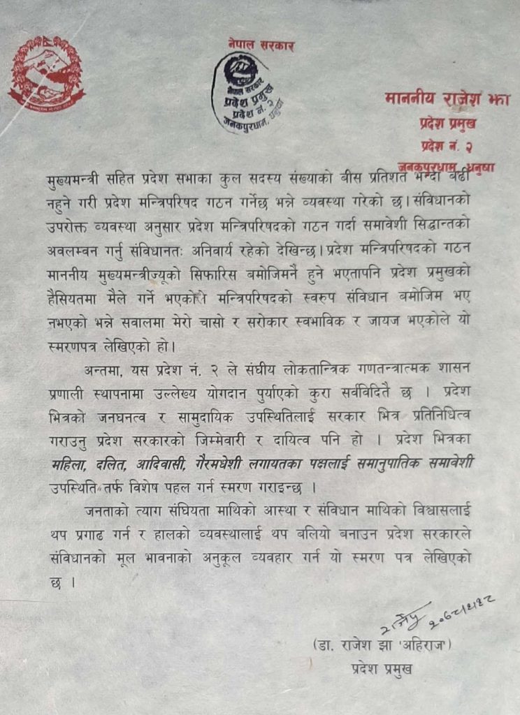 ‘‘प्रदेशभित्रको जनघनत्व र सामुदायिक उपस्थितिलाई सरकारभित्र प्रतिनिधित्व गराउनु प्रदेश सरकारको जिम्मेवारी र दायित्व पनि हो,’ पत्रमा झाले भन्नुभएको छ ‘प्रदेशभित्रका महिला, दलित, आदिवासी, गैरमधेशी लगायतका पक्षलाई समानुपातिक समावेशी उपस्थितितर्फ विशेष पहल गर्न स्मरण गराइन्छ।’