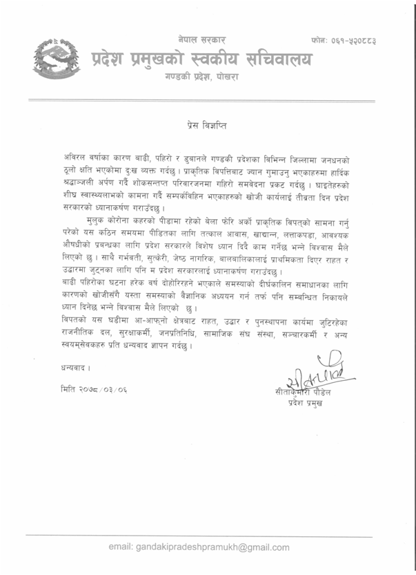 विज्ञप्तिमा भनिएको छ, “मुलुक कोरोना कहरको पीडामा रहेको बेला फेरि अर्को प्राकृतिक विपत्को सामना गर्नुपरेको छ, यस कठिन समयमा तत्काल पीडितका लागि आवास, खाद्य पदार्थ, लत्तकपडा र आवश्यक औषधिको प्रबन्धका लागि प्रदेश सरकारले विलम्ब नगरी विशेष प्राथमिकताका साथ काम गर्नेछ भन्ने विश्वास मैले लिएको छु ।”