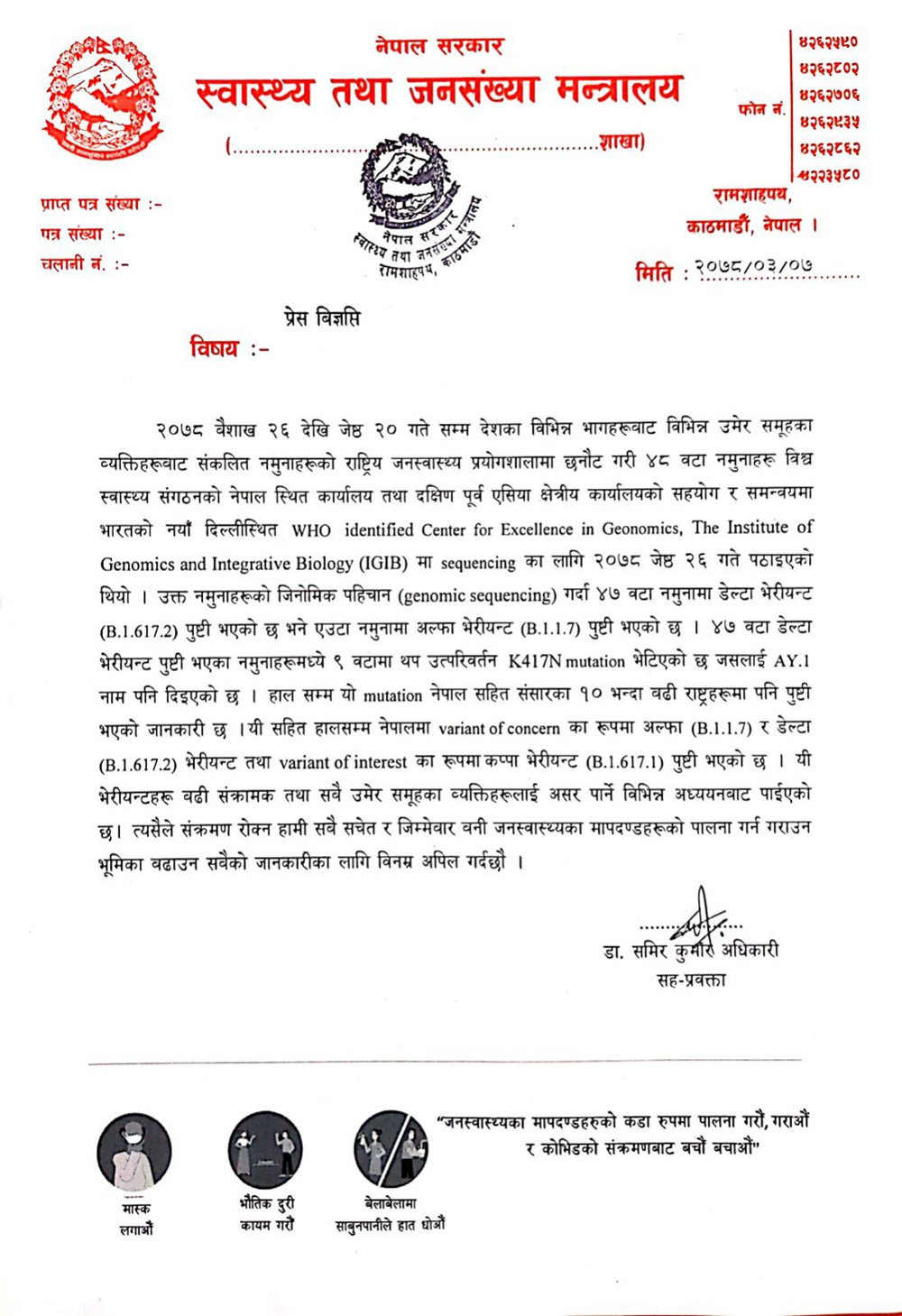 Deputy-Spokesperson at the Ministry Dr Samir Kumar Adhikari shared that among the 47 Delta variant confirmed during the gene sequencing, nine new K417 N mutation were detected which has been named AY.1 .