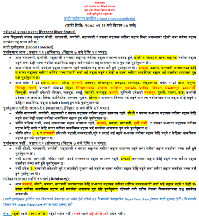 यसैबीच बाढी पूर्वानुमान महाशाखाले आज कहाँ–कहाँ बाढीको जोखिम छ भनेर अनुमान सार्वजनिक गरेको छ।