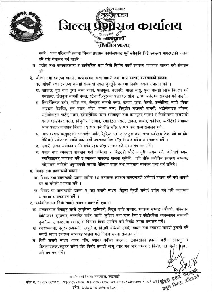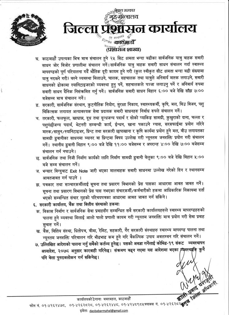 सार्वजनिक सवारीसाधन बिहान ६ बजेदेखि साँझ ७ बजेसम्म मात्रै सञ्चालन गर्न पाइने भएको छ। आदेशअनुसार माइक्रो बस भने चल्न नपाउने भएका छन्।