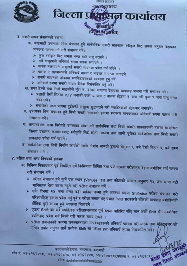According to Chief District Officer (CDO) of Kathmandu Kali Prasad Parajuli, the public vehicles have been ordered not to keep passengers more than their bearing capacity and follow all the health security protocols including use of face mask and gloves.
