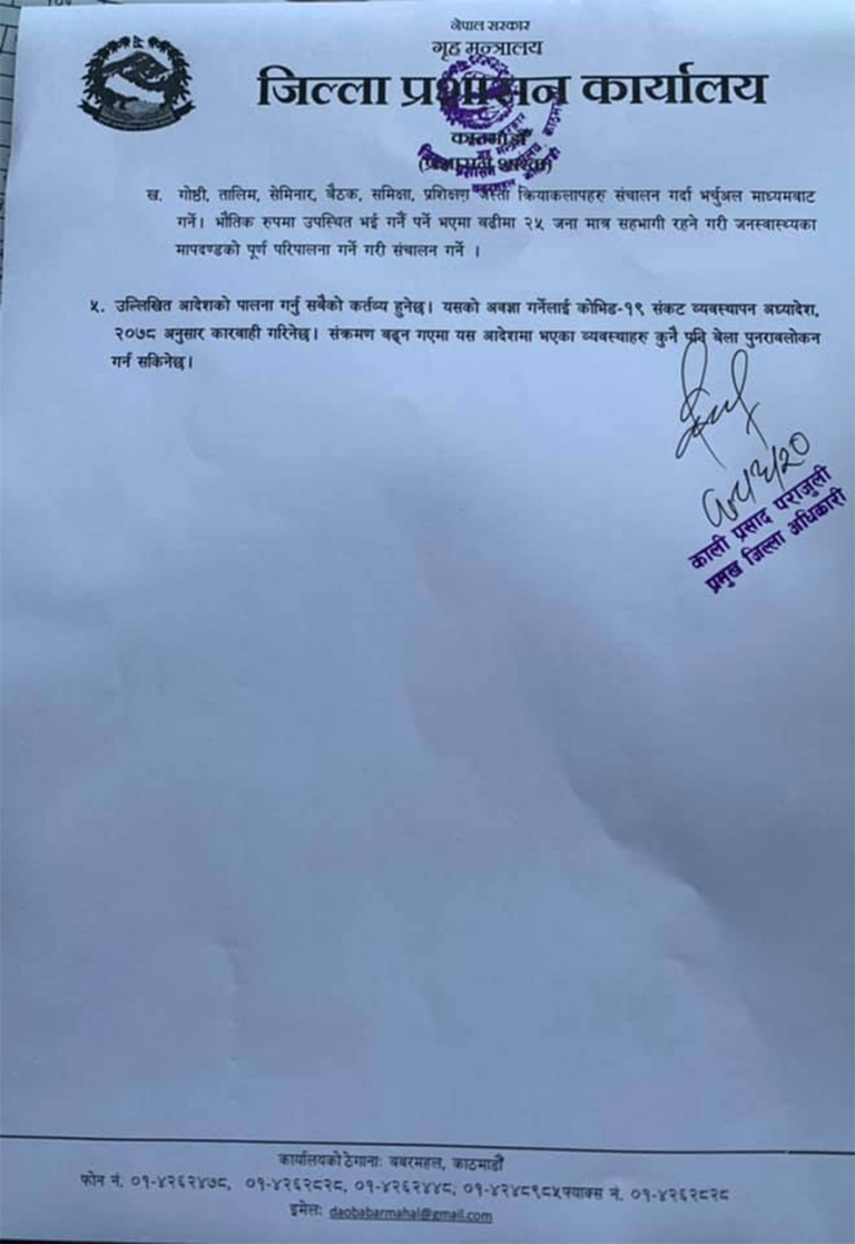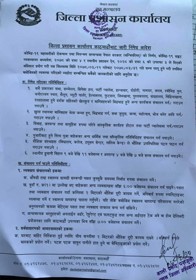 Kathmandu- With eased restrictions in place, the fresh prohibitory orders enforced by the District Administration Offices (DAOs) in the Kathmandu Valley have been implemented from today.