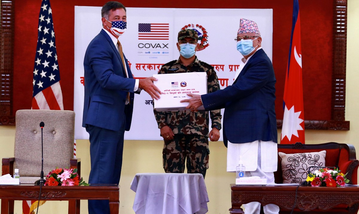 काठमाडौँ । प्रधानमन्त्री केपी शर्मा ओलीलाई अमेरिकी सरकारले उपलब्ध गराएको कोरोना भाइरस विरुद्धको खोप आज नेपालस्थित अमेरिकी राजदूत -याण्डी बेरीले हस्तान्तरण गर्नुभएको छ । प्रधानमन्त्री निवास बालुवाटारमा आयोजित ‘अमेरिकी सरकारबाट उपहारस्वरुप प्राप्त कोभिड–१९ विरुद्धको खोप हस्तान्तरण’ कार्यक्रममा प्रधानमन्त्री ओलीलाई राजदूत बेरीले खोप हस्तान्तरण गर्नुभएको हो । आज बिहान पौने १० बजे कतार एयरवेजमार्फत खोप नेपाल आइपुगेको हो ।