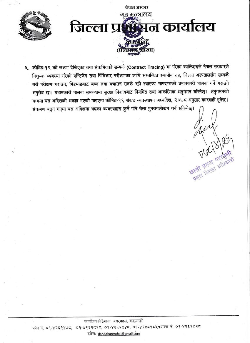 काठमाडौंका प्रमुख जिल्ला अधिकारी कालिप्रसाद पराजुलीका अनुसार कोभिड–१९ भाइरसको संक्रमण बढ्दै जाँदा रात्रिकालीन समयमा हुने सवारीसाधनको आवतजावतमा कडाइ गरिएको छ । अत्यावश्यक सवारीसाधन चाहिँ जतिसुकै वेला चल्न पाउने उहाँले बताउनुभयो । हाल जारी निषेधाज्ञा भोलि बुधबार सकिँदैछ । अरू निर्णयहरू साबिककै रहेका छन् ।