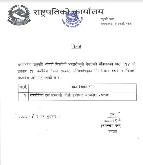राष्ट्रपति कार्यालय शीतल निवास स्रोतका अनुसार नेपालको संविधानको धारा ११४ को उपधारा १ बमोजिम मन्त्रिपरिषद्को सिफारिसमा राष्ट्रपति भण्डारीले अध्यादेश जारी गर्नुभएको जनाइएको छ ।