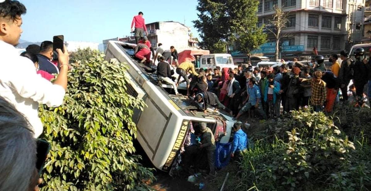 चितवन । कोहलपुरबाट सौराहा जाँदै गरेको बस नारायणगढको सडक छेउको घोलमा खसेको छ । सौराहा घुम्न आएका यात्रु बोकेको भे२ख २८३६ नम्बरको रिजर्भ बस आज बुधबार बिहान करिब साढे ८ बजे पूर्व–पश्चिम राजमार्ग अन्तर्गत नारायणगढ लायन्सचोकमा रहेको घोलमा खसेको हो ।