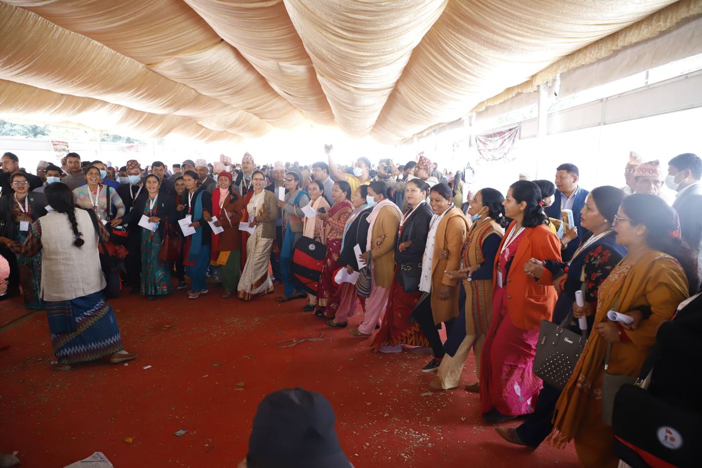 महाधिवेशनको आज तेस्रो दिन । तर, अध्यक्ष केपी ओलीसहित शीर्ष नेताहरू बैठकमै बसेकाले बन्दसत्र हलमा महाधिवेशन प्रतिनिधि भने देउडा गीत गाउँदै नृत्यमा रमाइरहेका छन् ।