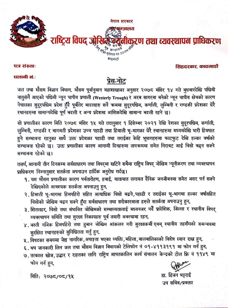 प्रवक्ता डिजन भट्टराईले जारी गरेको प्रेस नोटमा मौसम प्रतिकुल भएर पर्वतारोहण, हवाइ र यातायातसहित दैनिक जनजीवन प्रभावित हुनसक्ने चेतावनी दिइएको छ । ‘हिमाली भूभागमा हिमपहिरोसहित अत्यधिक चिसो बढ्ने, पहाडी र तराईका भूभागमा वर्षासहित चिसोको जोखिम रहेकाले सतर्कता अपनाउन प्राधिकरणले भनेको हो । योसँगै तराईमा शितलहर चल्न सक्ने आँकलन गरिएको छ ।