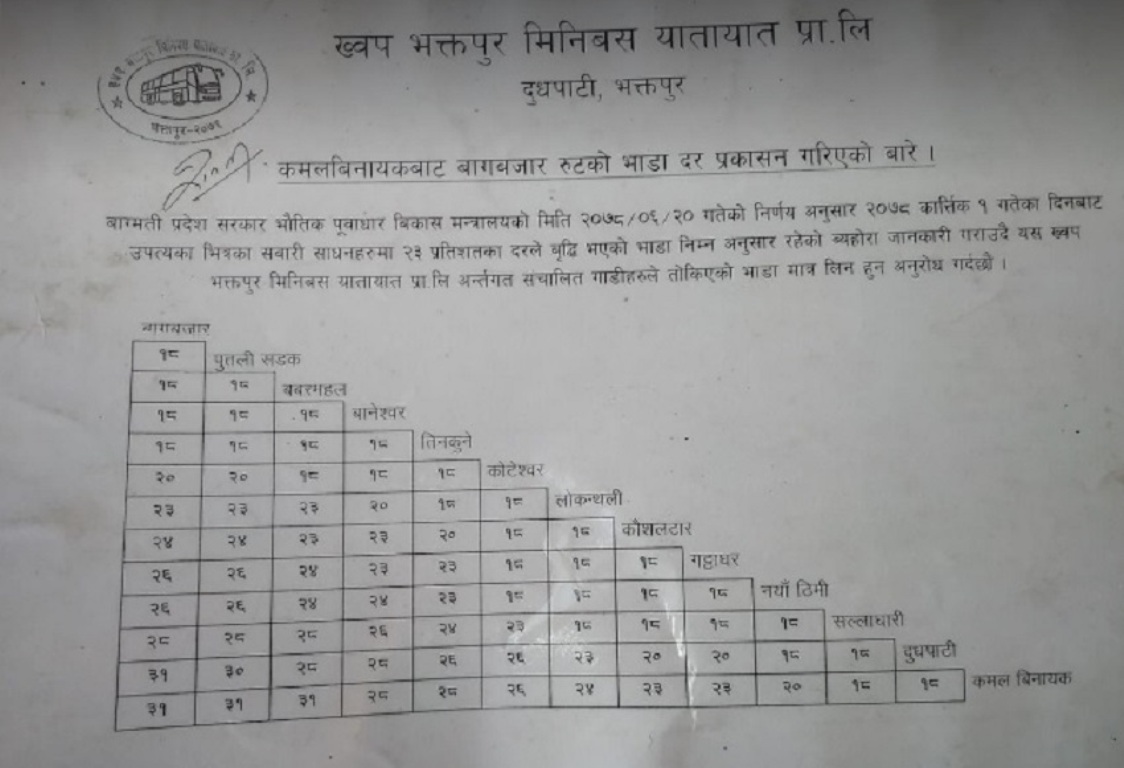 यात्रुले भाडा सूची हेरे । व्याँसीदेखि नयाँबानेश्वरभन्दा अझ अगाडि बिजुलीबजारसम्मको भाडा २८ रुपैयाँ कायम गरिएको थियो । ‘भाडा त २८ रुपैयाँ रहेछ नि,’ ती यात्रुले सहचालसँग प्रश्न गरे । । सहचालक कड्किँदै भाडा ३० रुपैयाँ नै लाग्ने बताए । ‘लागेको भाडा लिएको हो, हामीले बढी लिएका छैनौँ,’ सहचालकले भने ।
