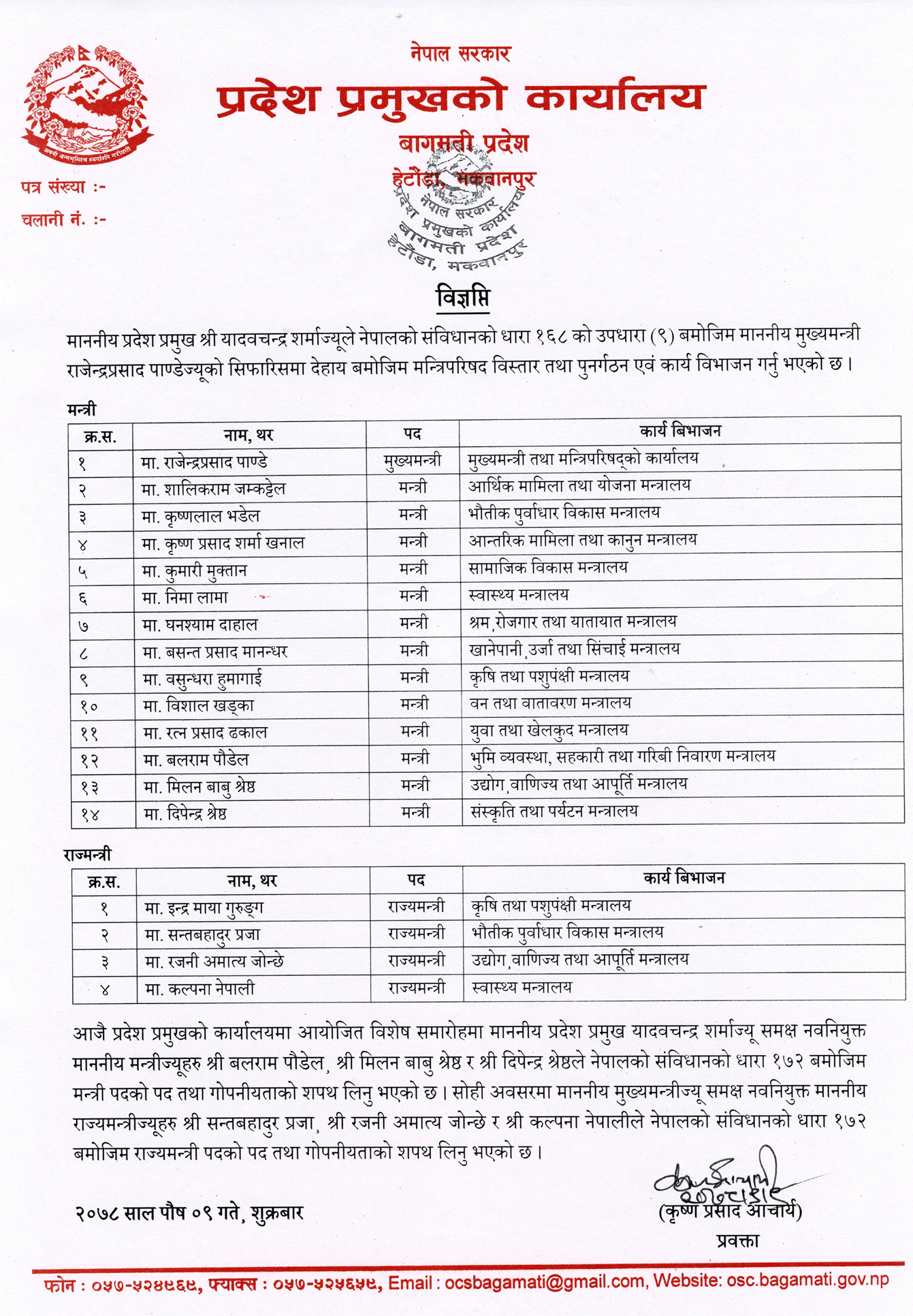 आज थपिएका तीन मन्त्री र तीन राज्यमन्त्री गठबन्धनको दल नेपाली कांग्रेसबाट थपिएका हुन् । यससँगै बागमतीको मन्त्रिपरिषद् १८ सदस्यीय बनेको छ ।