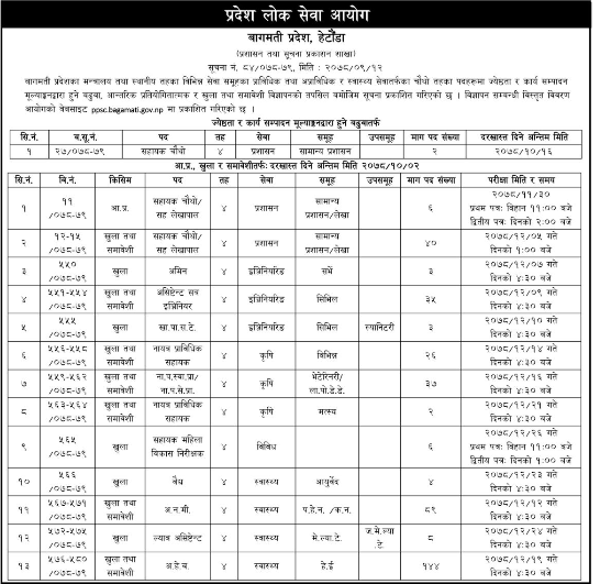 काठमाडौं । बागमती प्रदेश लोकसेवा आयोगले प्रदेश मन्त्रालय र स्थानीय तहमा कर्मचारीको स्थायी पदपूर्तिका लागि दरखास्त आह्वान गरेको छ ।