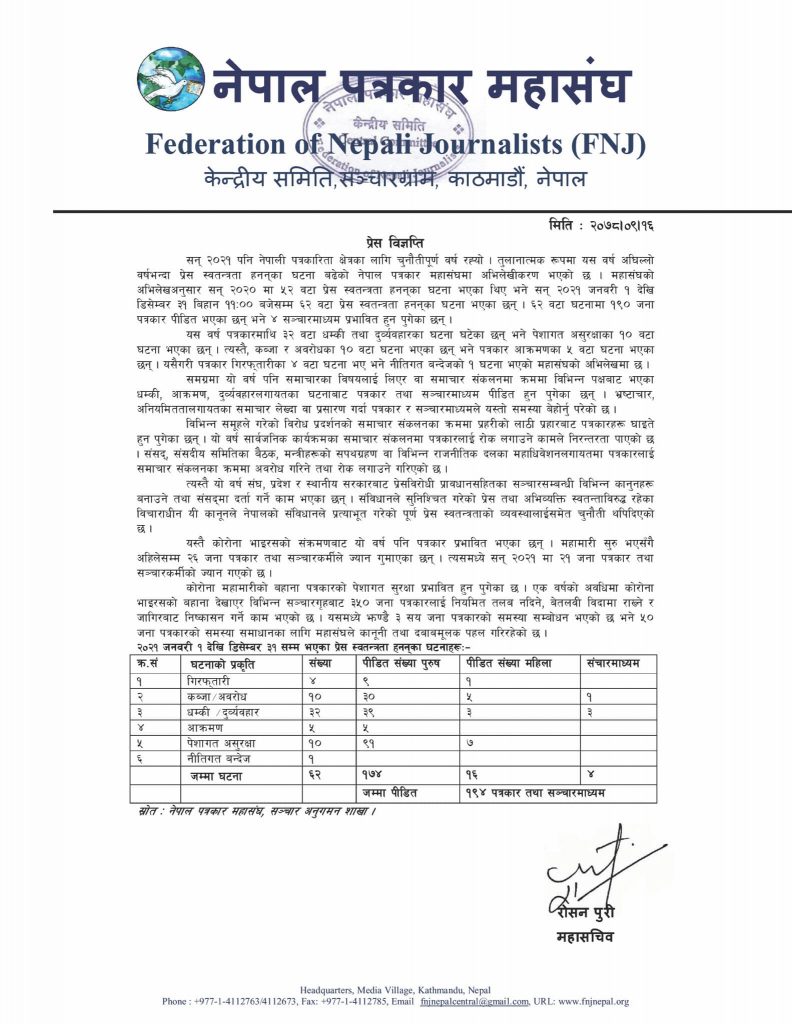 सन् २०२१ पनि नेपाली पत्रकारिता क्षेत्रका लागि चुनौतीपूर्ण वर्ष रहेको निष्कर्ष सार्वजनिक गर्दै महासंघले तुलानात्मक रूपमा यस वर्ष अघिल्लो वर्षभन्दा प्रेस स्वतन्त्रता हननका घटना बढेको अभिलेखीकरण सार्वजनिक गरेको छ ।
