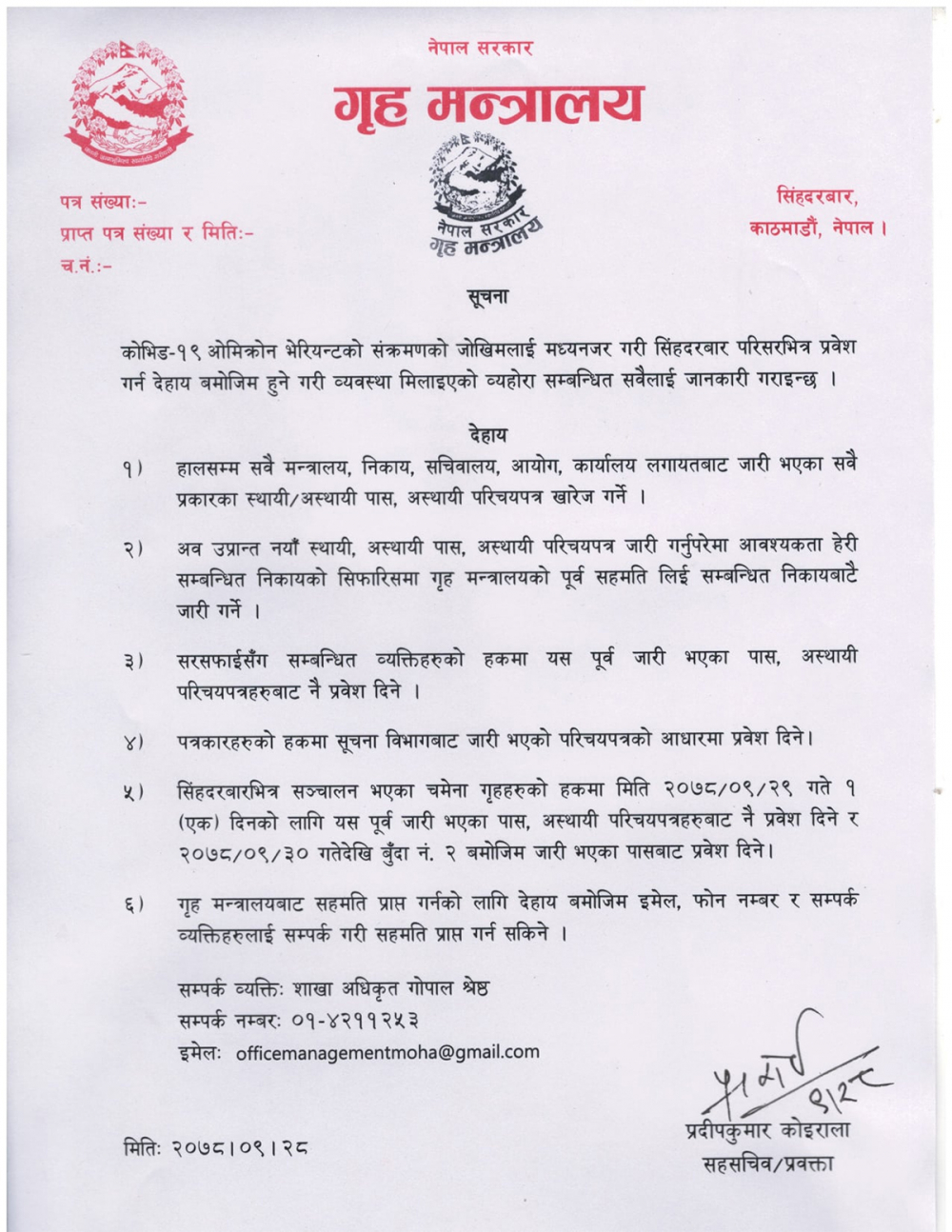 मन्त्रालयका सहसचिव एवं प्रवक्ता प्रदीपकुमार कोइरालाले बुधबार एक सूचना जारी गर्दै देशको प्रमुख प्रशाशनिक निकाय सिंहदरबार प्रवेश गर्न सबै मन्त्रालय, निकाय, सचिवालय, आयोगलगायतबाट हालसम्म जारी भएका सबै प्रकारका पास खारेज गर्ने उल्लेख गरिएको छ ।