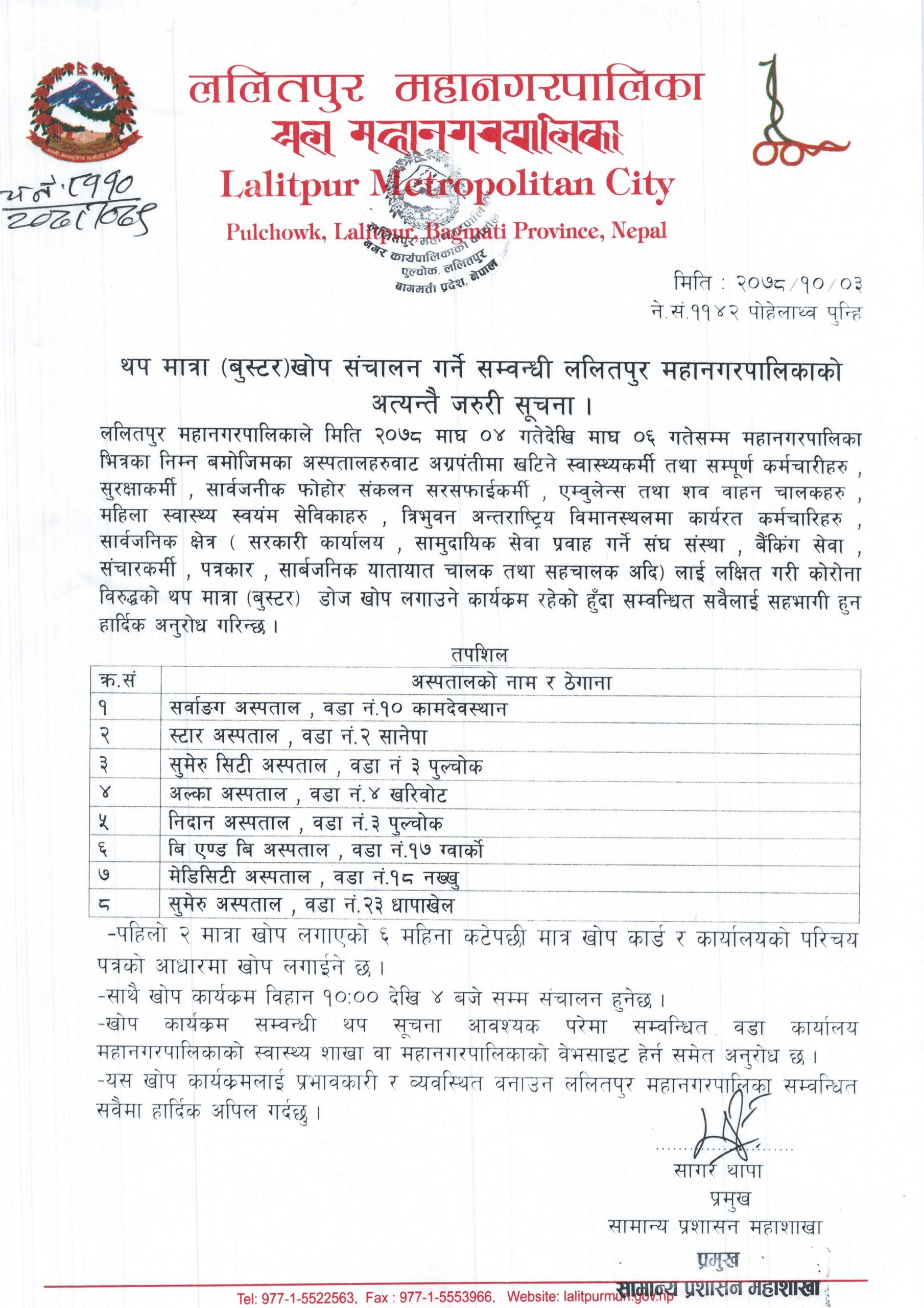 ललितपुर । ललितपुरमा आजबाट काेभिड-१९ विरुद्धकाे बुस्टर डाेज लगाइने भएकाे छ । ललितपुर महानगरपालिकाका अनुसार आजदेखि ६ माघसम्म अग्रपंक्तिमा कार्यरत स्वास्थ्यकर्मीसहितलाई बुस्टर डाेज लगाइन लागिएकाे हाे ।