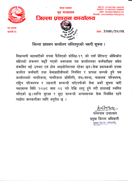 बिहीबारदेखि लागू हुने गरी नागरिकता, नागरिकता प्रतिलिपि, संघसंस्था, नाबालक परिचय पत्र, राष्ट्रिय परिचय पत्र र राहदानीसम्बन्धी फाँटर्फको सेवा अर्को सूचना जारी नहुँदासम्मका लागि स्थगित गरिएको छ । शान्ति सुरक्षा र मुद्दासम्बन्धी अत्यावश्यक सेवा भने नियमित रुपमा हुने छ ।