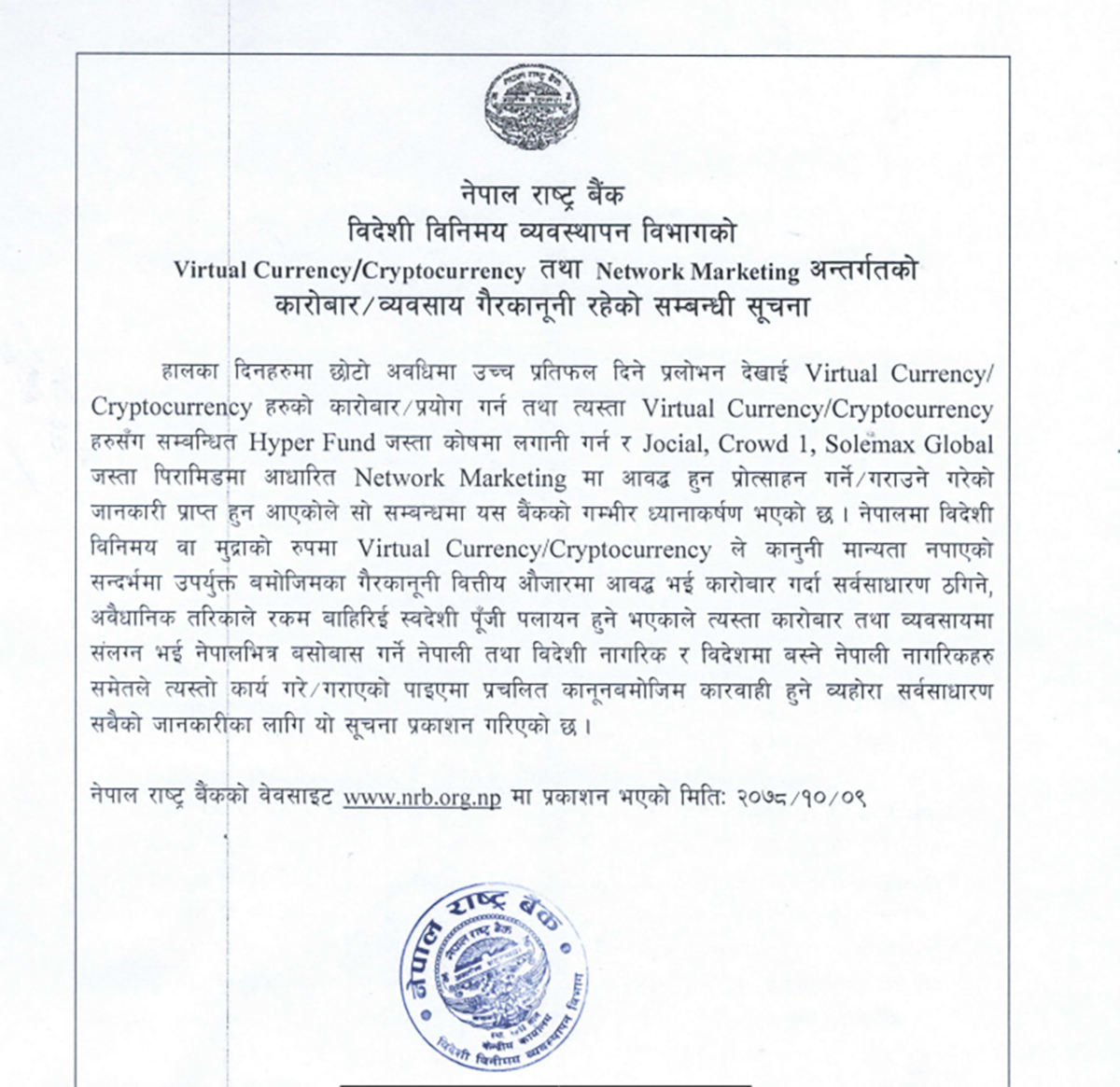 नेपालमा क्रिप्टोकरेन्सी तथा नेटवर्किङ व्यवसायले मान्यता पाएको छैन । अबैध कारोबार गर्दा सर्वसाधारण ठगिने, अवैधानिक तरिकाले रकम बाहिरिई पुँजी पलायन हुने भएकाले त्यस्ता कारोबार तथा व्यवसायमा संलग्न नहुन राष्ट्र बैंकले सूचना जारी गर्दै आग्रह गरेको छ ।