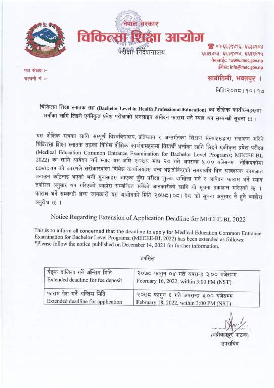 यसअघि माघ २० गतेसम्मको म्याद तोकिएको थियो । कोरोनाको तेस्रो लहरका कारण विभिन्न कार्यालय बन्द भई समयावधिभित्र आवश्यक कागजात तयार गर्न कठिनाइ हुने गुनासो आएपछि आयोगले परीक्षाको म्याद थप गरिएको जनाएको छ ।