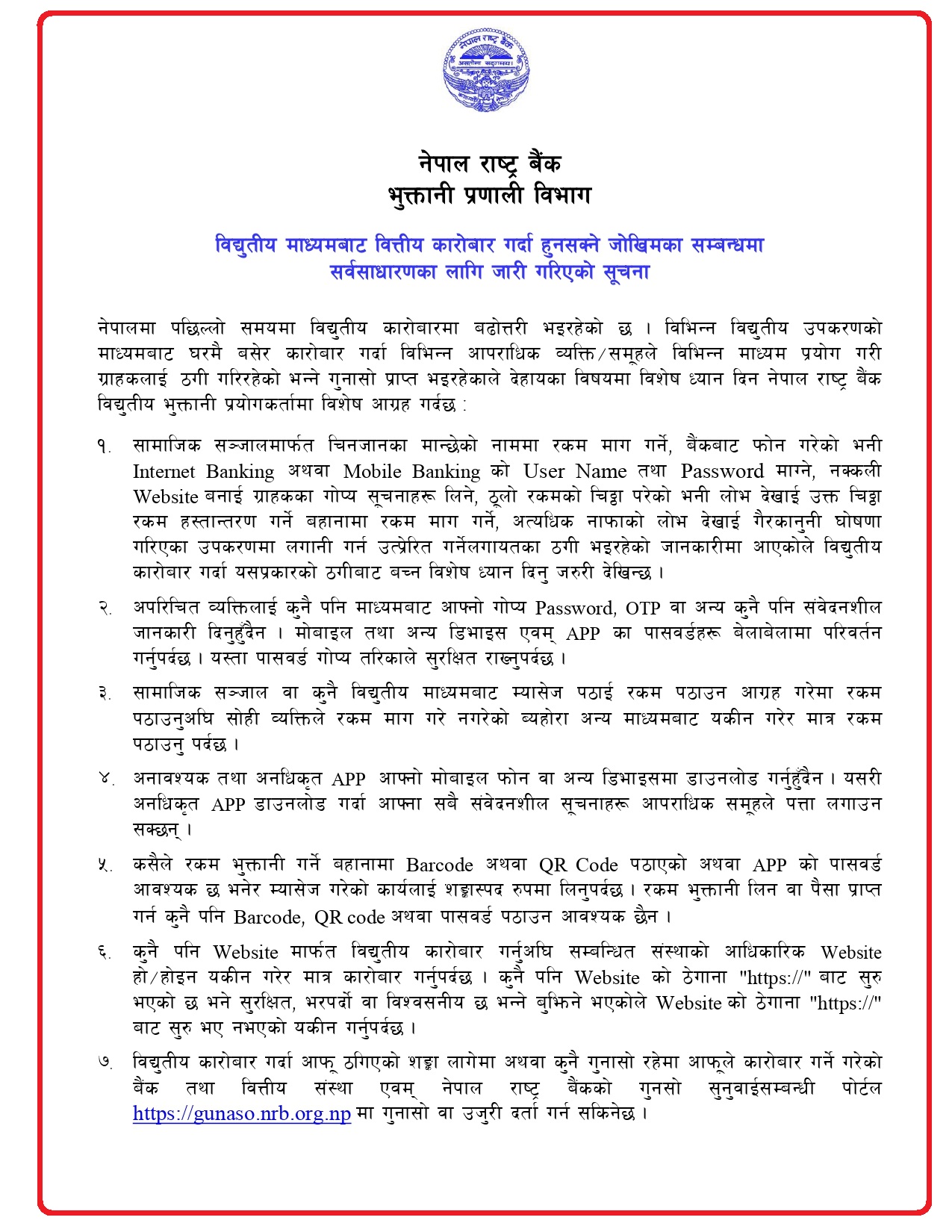 शुक्रबार सार्वजनिक सूचना जारी गरेर राष्ट्र बैंकले पछिल्लो समयमा विद्युतीय कारोबारमा ठगी भइरहेको गुनासो आएको भन्दै सचेत रहन आग्रह गरेको हो ।