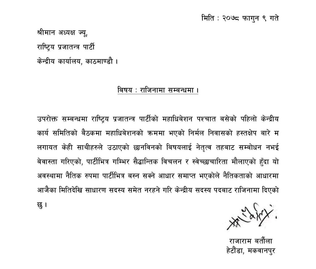 काठमाडौं । राजाराम बर्ताैलाले राप्रपाको साधारण सदस्यसमेत नरहने गरी राजीनामा दिएका छन् । कमल थापाले राप्रपा त्यागेर राप्रपा नेपालमा प्रवेश गरेपछि थापा उपप्रधानमन्त्री रहँदासमेत स्वकीय सचिव रहेका बर्ताैलाले पनि राप्रपा छाडेका हुन् ।