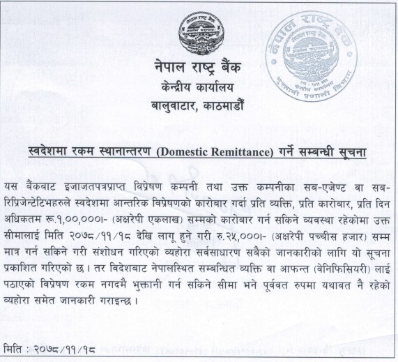 स्वदेशको एक स्थानबाट अर्को स्थानमा बैंकिङ प्रणालीमार्फत् हुने आन्तरिक रेमिट्यान्सको सीमा घटाइएको हो ।
