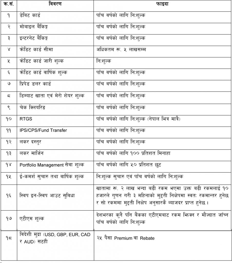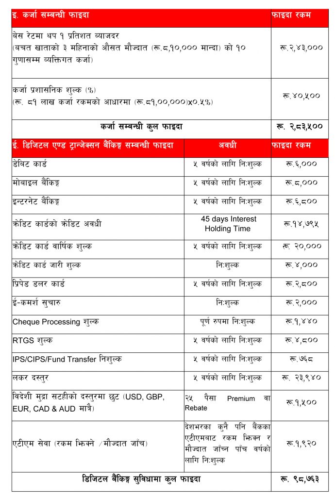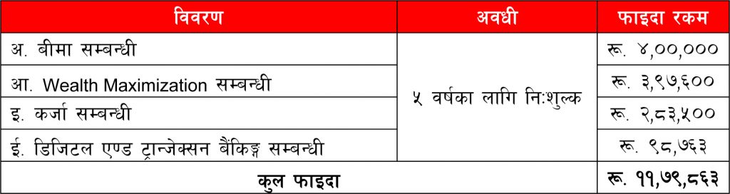बीमा तथा कर्जा सम्बन्धी सर्वश्रेष्ठ फाइदाहरूका साथसाथै हामीले सर्वश्रेष्ठ बचत खातामा प्रदान गर्दै आएको १८ अन्य सर्वश्रेष्ठ फाइदाहरूलाई पाँच वर्षको अवधीसम्म निःशुल्क उपलब्ध गराएका छौं । जसलाई निम्नानुसार तालिकामा देखाइएको छ ः