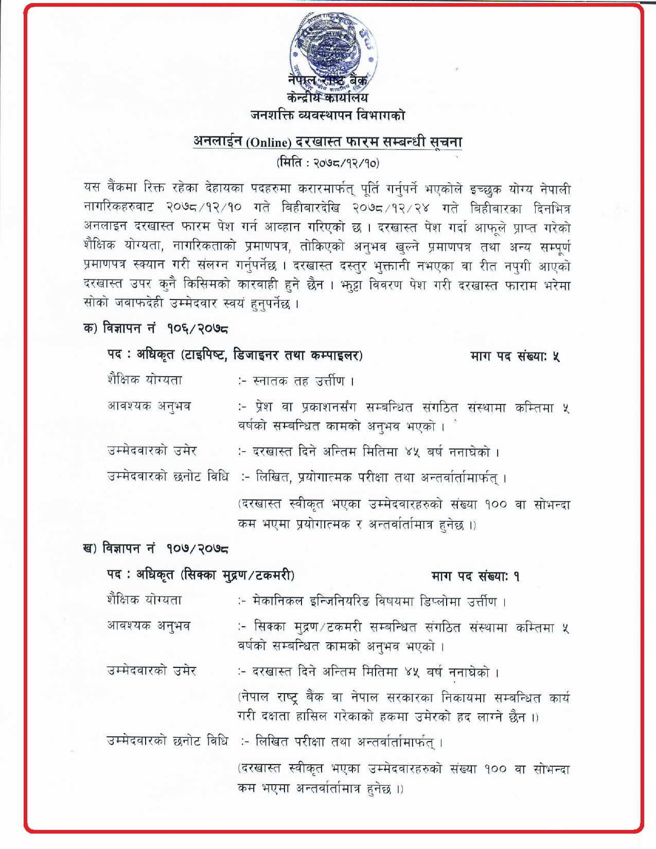 अधिकृत (सिक्का, मुद्रण/टकमरी) र अधिकृत (टाइपिष्ट, डिजाइनर तथा कम्पाइलर) करारका लागि विज्ञापन आह्वान गरिएको छ ।
