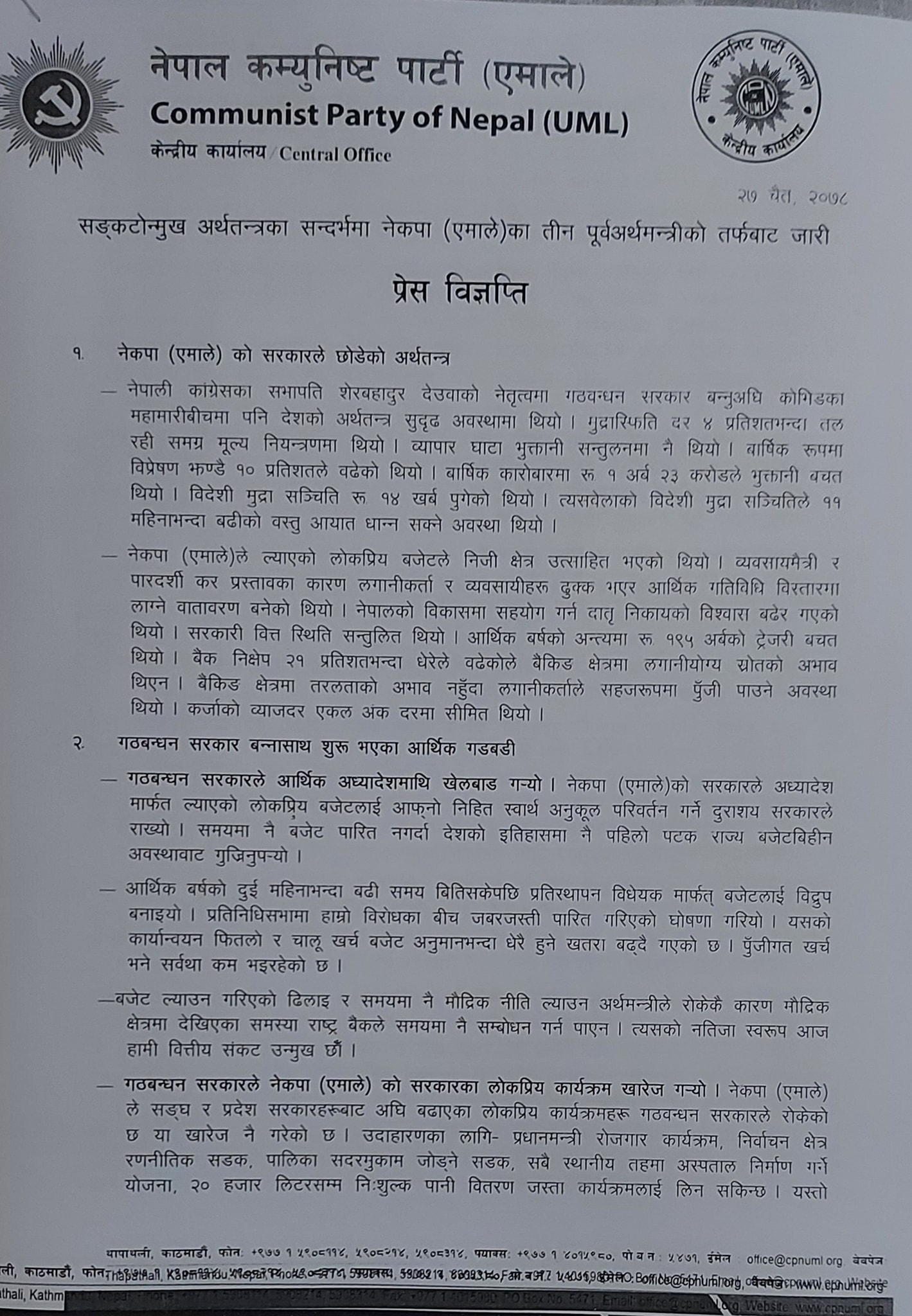 काठमाडौं । एमालेले आइतबार देशको अर्थतन्त्रबारे आफ्नो धारणा सार्वजनिक गरेको छ । एमालेबाट अर्थमन्त्री भएका तीनजनाले पत्रकार सम्मेलन गरेर धारणा सार्वजनिक गरेका हुन् ।