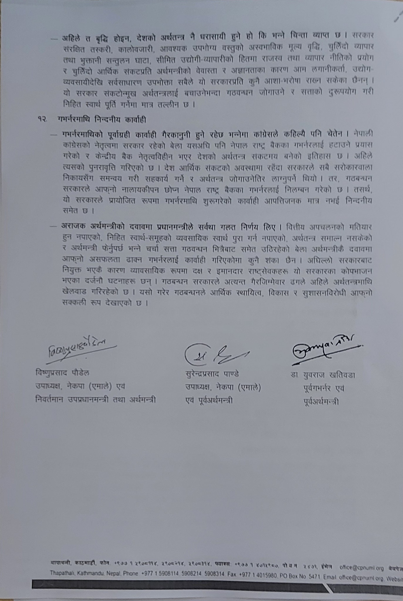 हरेक दृष्टिकोणले अब्बल भूमिकामा रहेका गर्भनरलाई सरकारका अवाञ्छित गतिविधि पुरा गर्न नदिएको अवस्थामा निलम्बन गरेको उनको दावी छ । ‘राष्ट्र बैंक एउटा स्वायत्त संस्था हो । मन्त्रीले आफ्नो अभिन्न अंगको रूपमा विकास गरे । राष्ट्र बैंकमाथि अर्थमन्त्रीले हस्तक्षेप गरे ।’ पौडेलले भने ।