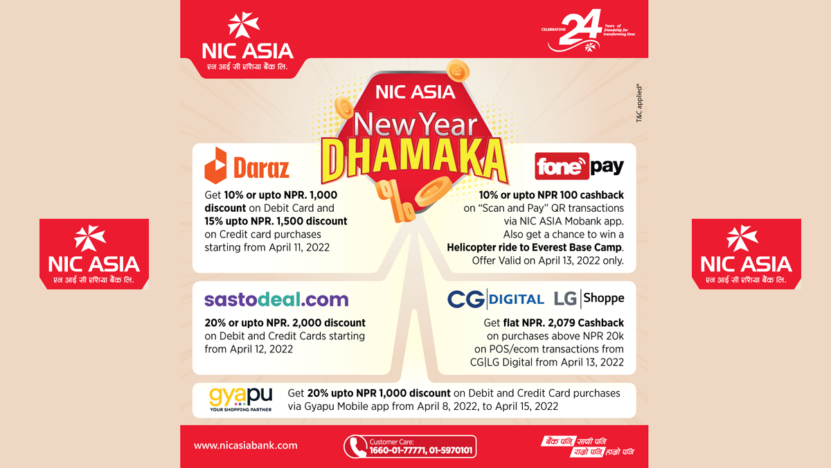 काठमाडौं । नयाँ वर्ष २०७९ ले सम्पूर्ण ग्राहकहरूमा नयाँ आशा, भरोसा एवं उमंग प्रदान गरोस् भन्ने शुभेच्छाका साथ एन आई सी एशिया बैंकले विभिन्न ई–कमर्शहरूबाट सामग्रीहरू किनमेल गरी डेबिट तथा क्रेडिट कार्ड मार्फत डिजिटल भुक्तानी गर्दा २० प्रतिशतसम्मको आकर्षक छुट योजना सार्वजनिक गरेको छ ।